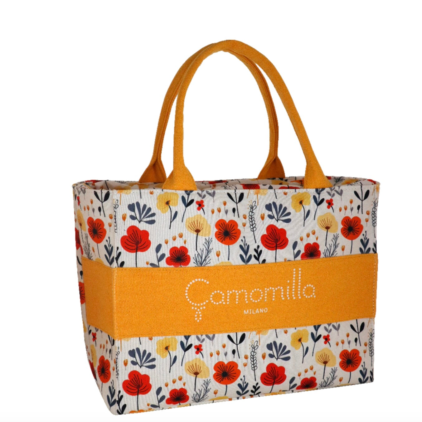BORSA MARE M PAPAVERI in tessuto a fiori con fascia centrale e manici in tessuto a tinta unita con logo a contrasto.