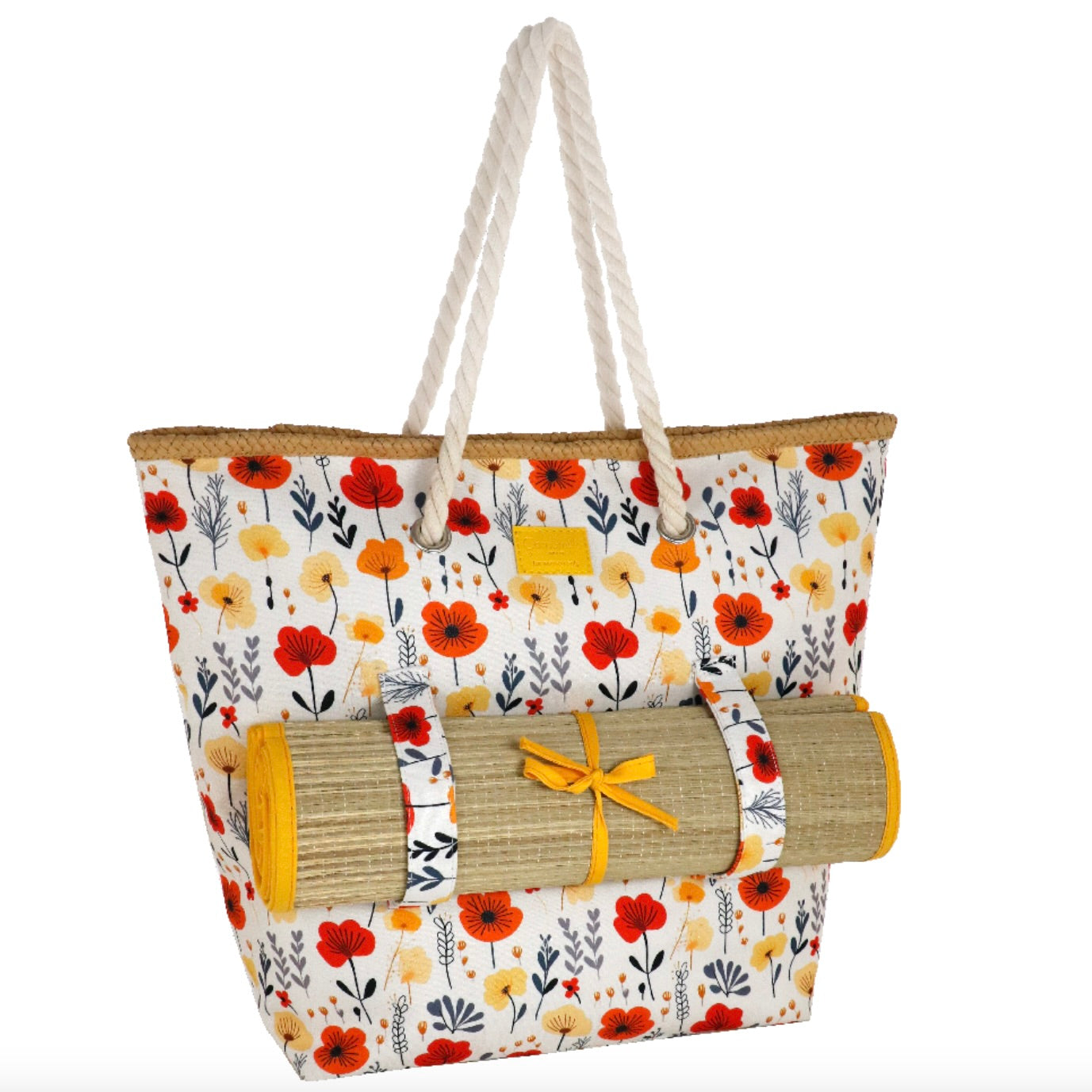 BORSA MARE L STUOIA PAPAVERI in tessuto a fiori bordato da un intreccio in fibre naturali e con pratica stuoia arrotolata che si aggancia alla borsa. Manici in corda.