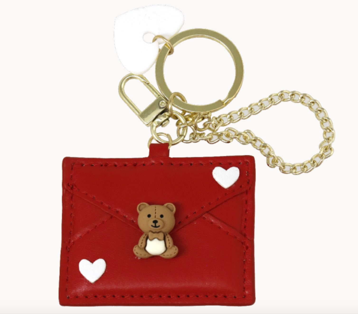 PORTACHIAVI LOVE LETTER BUSTA IN PELLE SINTETICA CON ORSETTO E CUORICINI APPLICATI, CHARM A FORMA DI CUORE IN ACRILICO. DA USARE SIA COME PORTACHIAVI O COME ACCESSORIO PER LA BORSA GRAZIE AL GANCIO E ALLA CATENA CHE PERMETTONO DI LEGARLO AD UNA ZIP O AL MANICO DELLA BORSA.
