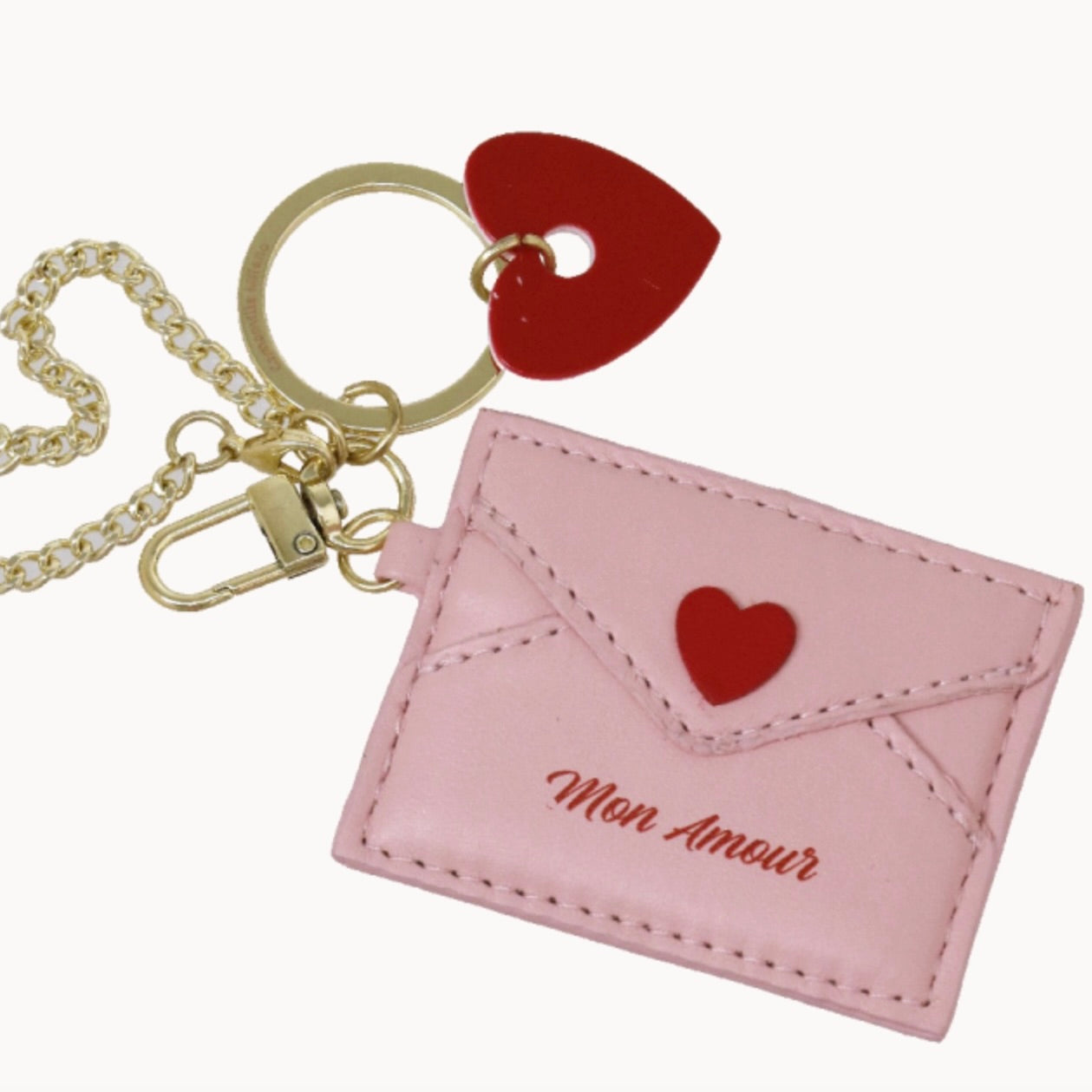 PORTACHIAVI MON AMOUR BUSTA IN PELLE SINTETICA CON CUORE APPLICATO, CHARM A FORMA DI CUORE IN ACRILICO. DA USARE SIA COME PORTACHIAVI O COME ACCESSORIO PER LA BORSA GRAZIE AL GANCIO E ALLA CATENA CHE PERMETTONO DI LEGARLO AD UNA ZIP O AL MANICO DELLA BORSA.