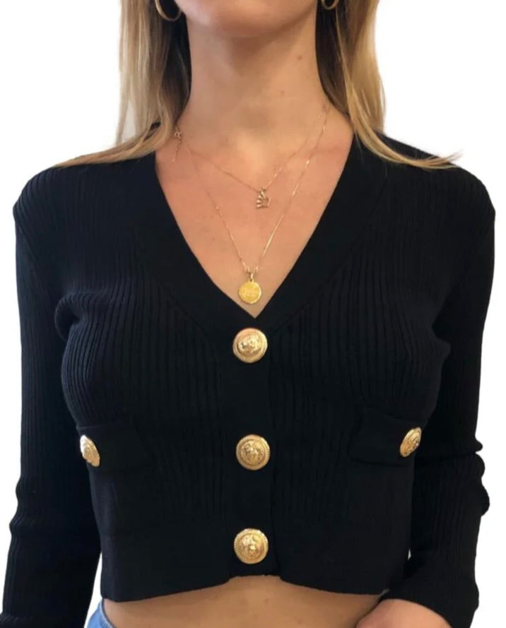 Questo giacchino crop è ideale per abbinamenti con pantaloni a vita alta o gonne a tubo. I bottoni dorati aggiungono un dettaglio di classe e luminosità, donando un tocco di eleganza.