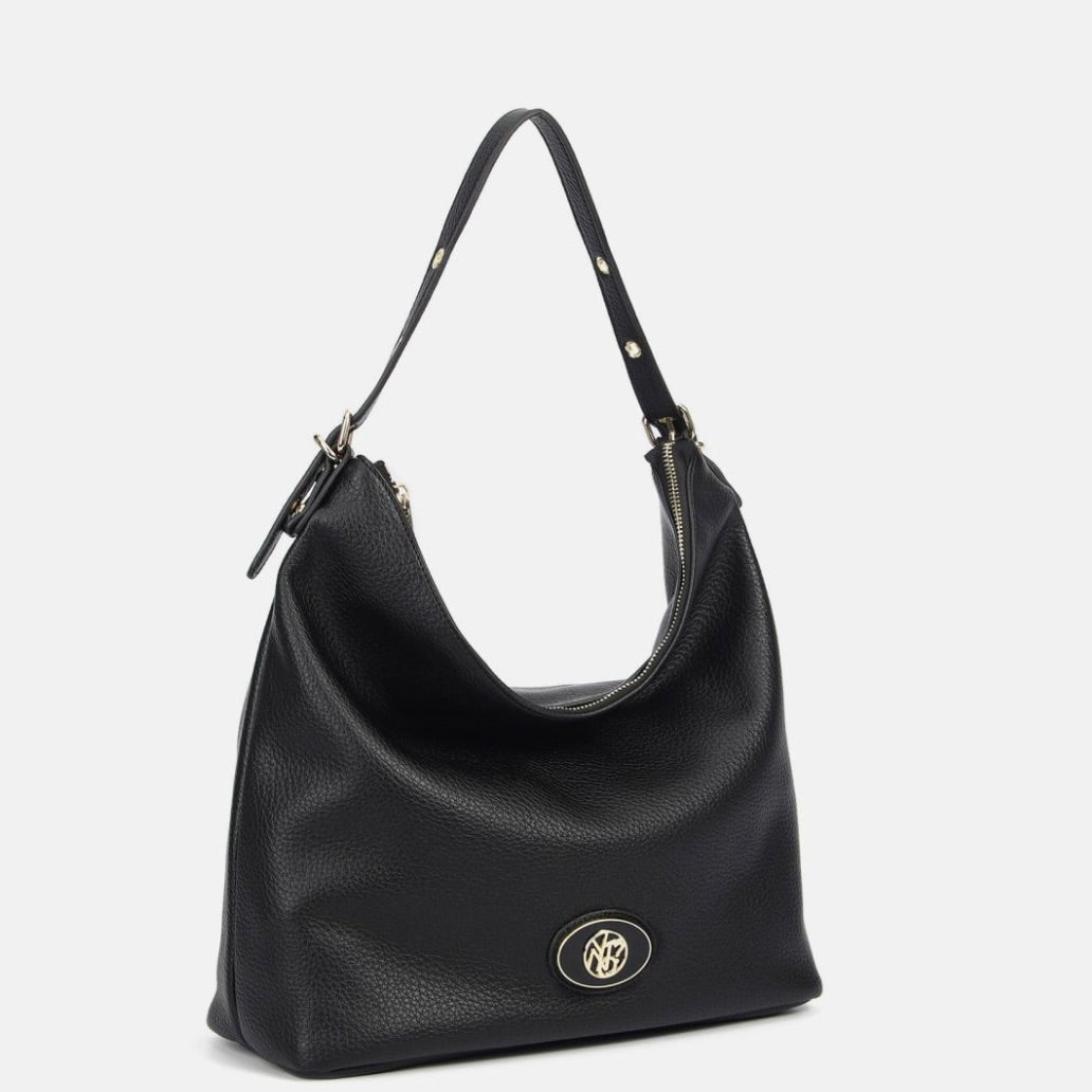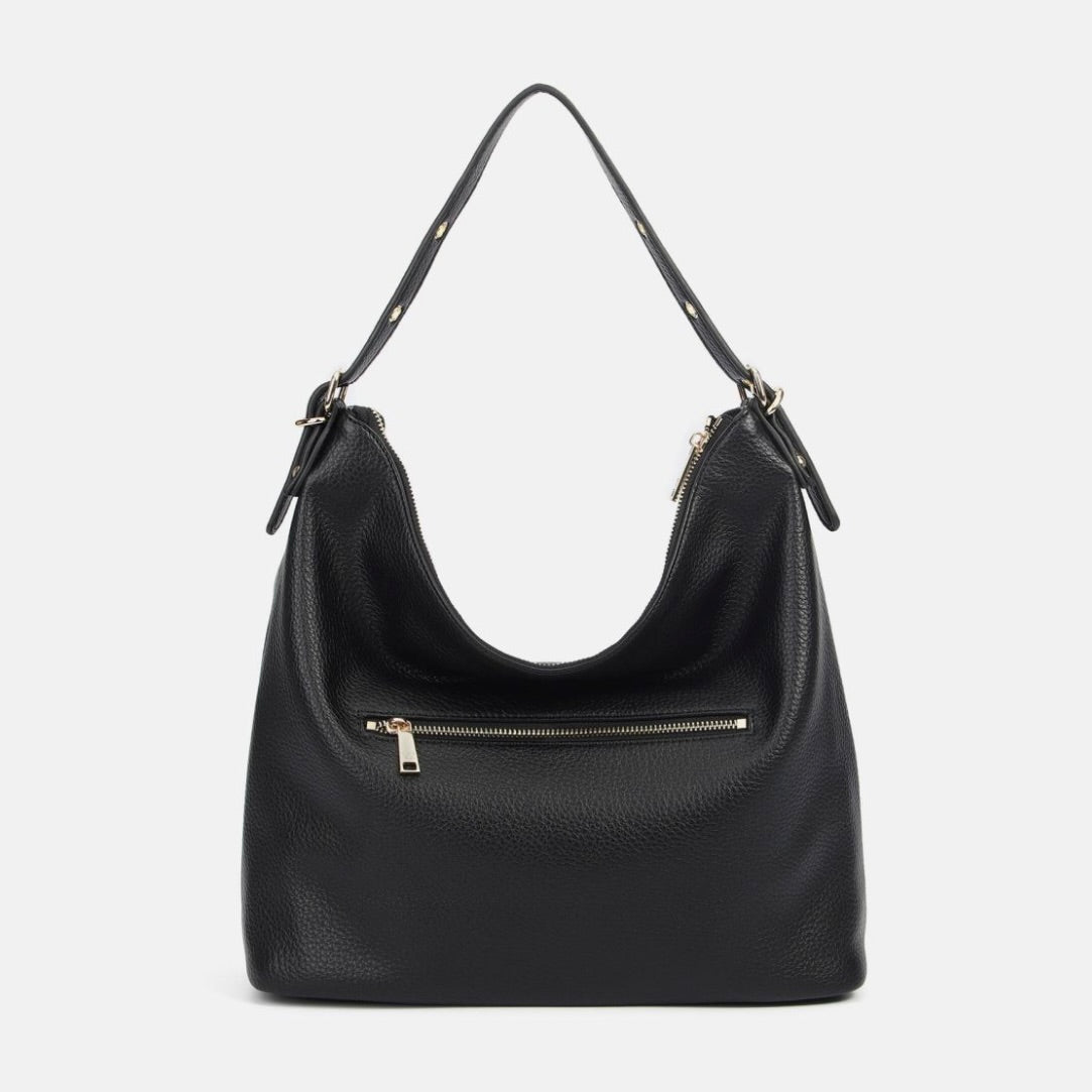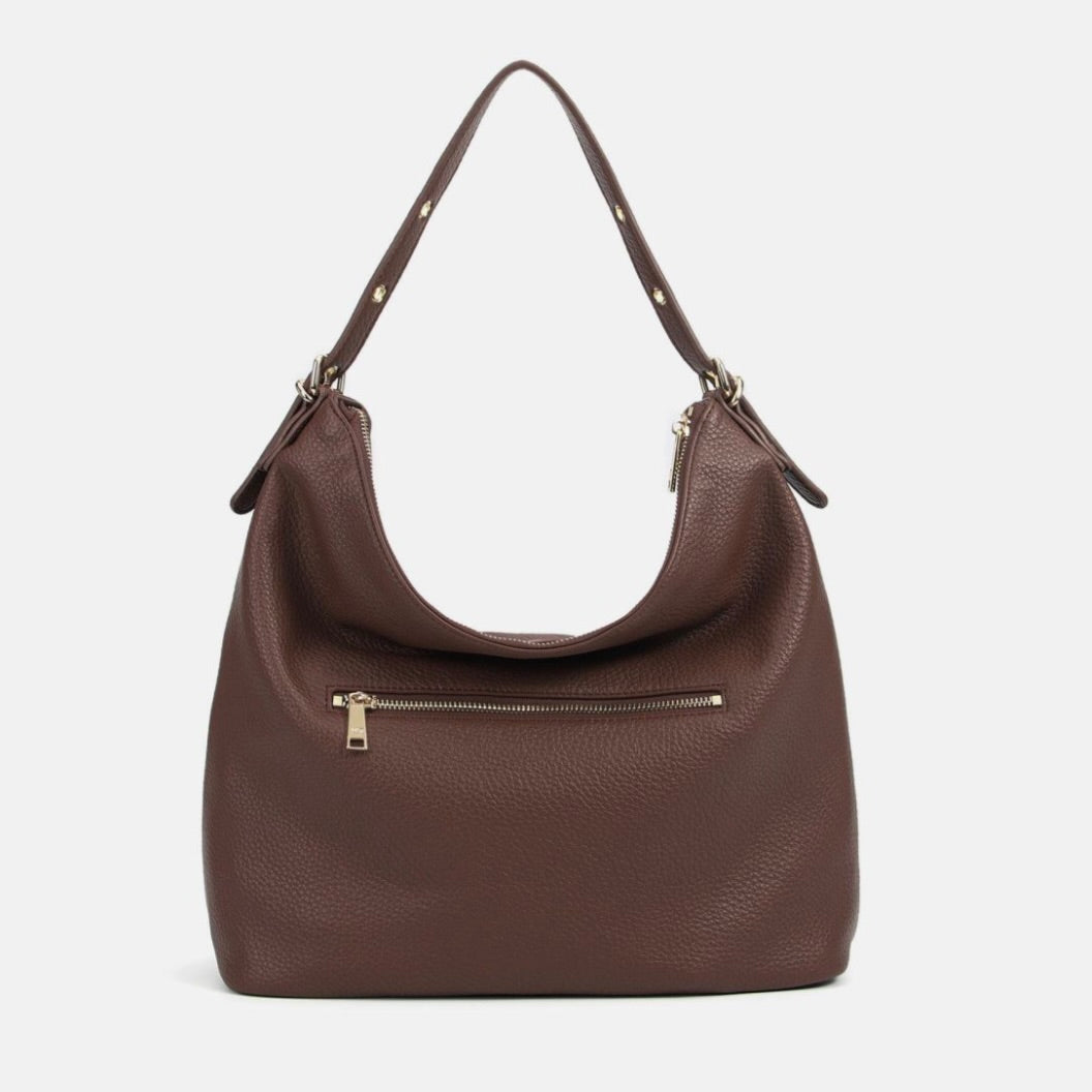 Borsa hobo donna morbida e capiente, perfetta per l’uso quotidiano. Il manico singolo è regolabile tramite fibbia con fori, così puoi adattare la caduta sulla spalla in base a come preferisci indossarla. La chiusura superiore con zip protegge portafoglio, smartphone e oggetti personali durante la giornata, mentre la tasca con zip sul retro è pensata per avere subito a portata di mano telefono, chiavi o badge senza aprire la borsa.