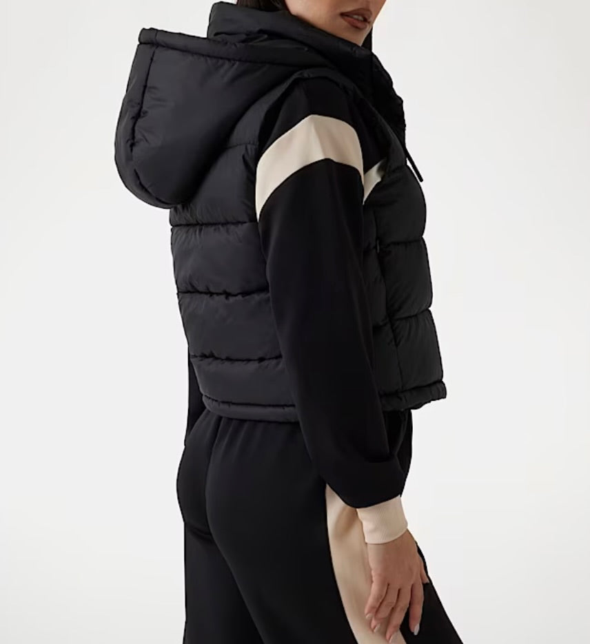 Piumino in tessuto sintetico. Girocollo con cappuccio. Senza maniche. Vestibilità regular. Chiusura con bottoni.
